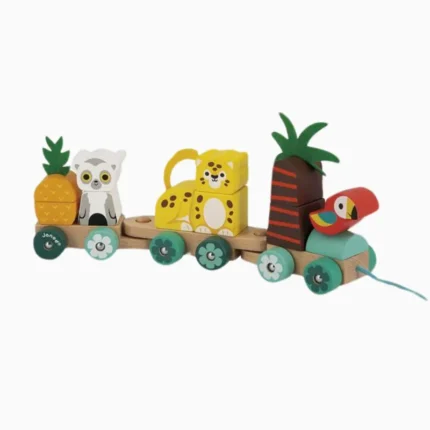 Com cores vibrantes e personagens tropicais, esse trem de madeira combina construção e movimento para encantar crianças a partir de 1 ano. Seus 3 vagões removíveis permitem empilhar peças que se transformam em animais e elementos da floresta, como papagaio, onça, lêmure, palmeira e abacaxi. O barbante de algodão é perfeito para puxar o trem pela casa, ajudando nos primeiros passos e desenvolvendo habilidades motoras de forma divertida e segura.